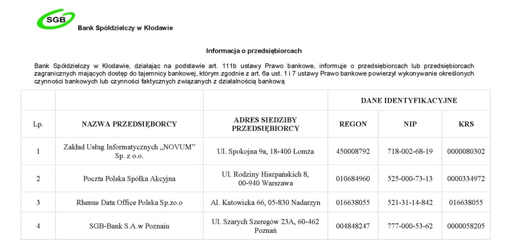 Bank Spółdzielczy w Kłodawie, działając na podstawie art. 111b ustawy Prawo bankowe, informuje o przedsiębiorcach lub przedsiębiorcach zagranicznych mających dostęp do tajemnicy bankowej, którym zgodnie z art. 6a ust. 1 i 7 ustawy Prawo bankowe powierzył wykonywanie określonych czynności bankowych lub czynności faktycznych związanych z działalnością bankową